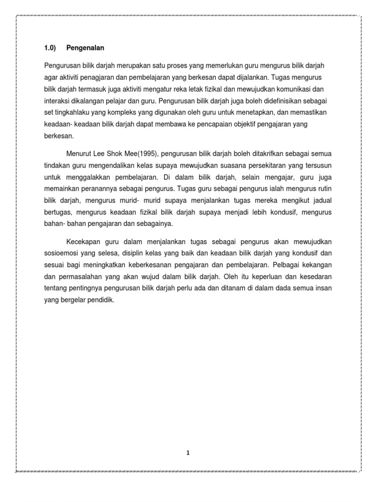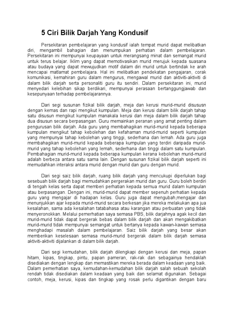 Oleh itu penguatkuasaan peraturan bilik darjah perlu untuk memastikan aktiviti bilik darjah berjalan lancer. Pengurusan bilik darjah adalah satu proses pembentukan suatu alam pembelajaran serta usaha untuk mengekalkannya dimana iklimnya kondusif untuk pelaksanaan proses pengajaran dan pembelajaran agar objektif yang ditetapkan tercapai (mok soon sang, 2011). Menurut marland (1975), suasana fizikal bilik darjah mungkin 1.1 konsep persekitaran bilik darjah yang kondusif persekitaran pembelajaran yang kondusif ialah tempat murid dapat melibatkan diri. Persekitaran yang kondusif dapat membantu mewujudkan keselesaan pengajaran dan pembelajaran di. Pengenalan bilik darjah merupakan objek fizikal yang tidak bernyawa.
