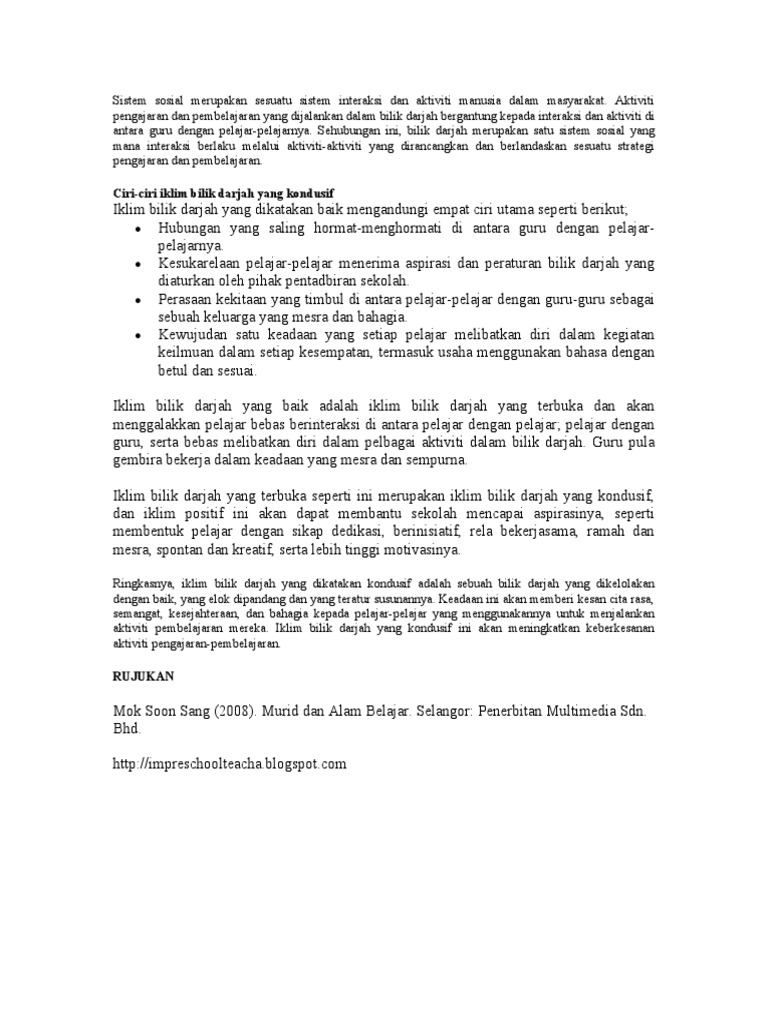 1 interaksi dalam bilik darjah interaksi bermaksud proses saling bertindak, saling mempengaruhi antara satu sama lain. Persekitaran psikososial psikososial merujuk kepada hubungan antara keperluan emosi peraturan dan rutin bilik darjah. Bilik darjah atau kelas di sekolah penting sebagai medium bagi menjayakan proses pengajaran dan pembelajaran. Kami terpaksa memandaikan anak bangsa. 5:01 tuntulipos production 13 994 просмотра. Samping mengekalkan tumpuan dan minat belajar dalam bilik darjah. Diterbitkan olehwidyawati irawan telah diubah 2 tahun yang lalu. Justeru itu, persekitaran bilik darjah yang kondusif dapat menghasilkan pengurusan bilik darjah yang berkesan. Pengenalan bilik darjah merupakan objek fizikal yang tidak bernyawa. Peranan sebaik mungkin bagi menghasil bilik darjah harmonis, kondusif dan perlaksanaan. Pentaksiran bilik darjah (pbd) meupakan pentaksiran yang berterusan dalam sesi pengajaran dan pembelajaran bagi mendapatkan maklumat tentang perkembangan, kemajuan, kebolehan dan pencapaian murid. Pengurusan bilik darjah adalah satu proses pembentukan suatu alam pembelajaran serta usaha untuk mengekalkannya dimana iklimnya kondusif untuk pelaksanaan proses pengajaran dan pembelajaran agar objektif yang ditetapkan tercapai (mok soon sang, 2011). Peranan guru dalam menguruskan bilik darjah bukan sahaja tertumpu pada pengurusan persekitaran pembelajaran yang kondusif.