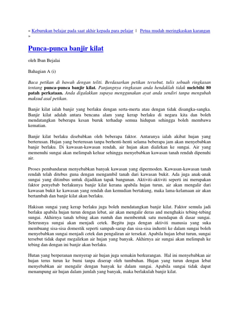 Contoh karangan pencemaran sungai : Air merupakan salah satu unsur yang memiliki peran sangat penting. Ini adalah kerana, penerokaan yang dijalankan sudah pasti menyebabkan hakisan tanah berlaku dan seterusnya tanah runtuh akan masuk ke dalam sungai danmenjadi mendakan. Suatu masa dahulu,sebaliknya air kini perlu dirawat dahulu sebelum selamat digunakan. Selain itu pencemaran air juga menjadi punca kepada banjir yang berlaku di dunia pada masa kini. Contextual translation of karangan punca pencemaran air into english. Pencemaran air juga memberi kesan kepada tanah basah. Seterusnya, pencemaran air juga menyebabkan keindahan dunia pada masa kini terjejas. Punca pencemaran tidak tetap (nps) bahagian air & marin, jabatan alam sekitar 2018. Rujukan saya seterusnya ialah pencemaran laut; Punca berlakunya pencemaran air pencemaran air boleh dikatakan sebagai perubahan yang berlaku kepada sumber air dari segi kandungan, keadaan, bau dan warna air yang akan memberi kesan kepada kehidupan. Pencemaran air, cara mengatasi dan dampaknya bagi kehidupan. Air yang begitu mempunyai banyak.