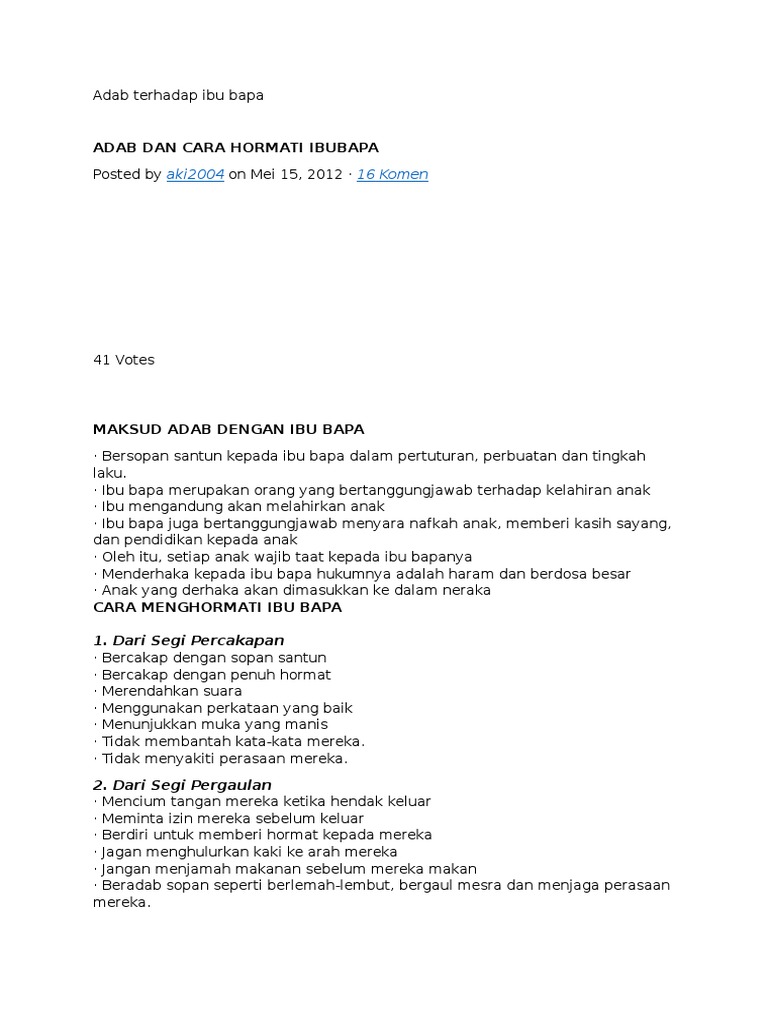 Berbuat baik ketika mereka meniggal sentiasa mendoakan mereka memohon. Ibu telah memberikan begitu banyak cinta kepadaku. Tidak meninggikan suara kepada mereka. Nurul adila binti ahmad fauzi. Tapi sebelum membaca doa untuk anak degil itu, ibu bapa harus tahu dan mengenal pasti punca masalah tingkah laku anak tersebut terlebih dahulu. Noor hayati othman, 52, berkata, dia yang sebelum ini bekerja di sebuah kilang membuat keputusan itu dengan. Semasa ibu bapa masih hidup. Patuh dan taat kepada ibu bapa 2. 7 adab kepada ibu bapa mengasihi dan. Sarana ibu bapa & sekolah skcc segamat 2013, aktiviti sarana ibu bapa 2013. 4 bersyukur kepada allah dan kemurkaan allah terletak kepada kemurkaan ibubapa. Jasa ibu yang mengandungkan kita dan bakti bapa yang membela kita sehingga dewasa tidak mampu dibalas dengan emas permata atau wang ringgit. Terdapat 10 tanggungjawab yang boleh dilakukan oleh anak terhadap ibu bapa mereka.