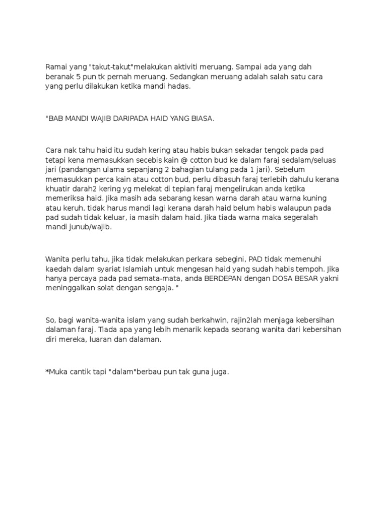 Jika semasa solat, keluarnya cecair dan kita tidak pasti sama ada cecair itu asalnya datang dari luar atau dari dalam faraj, tidak batal wuduk. Tidak ada dalam islam yang menyuruh kita meruang. Jika faraj anda terasa longgar, tiada gigi dan berlecak, maksudnya faraj sudah longgar. Jika semasa solat, keluarnya cecair, dan kita tidak pasti sama ada cecair itu asalnya datang dari luar atau dari dalam faraj, tidak batal wudu. Afida sohana penulisan ini ditulis dr. Proses meruang (vaginal douching) tidak wajib dilakukan kecuali jika najis dari dalam keluar terkeluar secara zat zahirnya. Dalam amalan orang melayu, meruang merupakan satu proses di mana kita memasukkan jari ke dalam faraj bagi tujuan membersihkan ruang dalaman faraj. Pendapat mengenai lendir daripada faraj wanita ada dua pendapat salah satunya adalah suci dan inilah yang shahih dalam mazhab kami secara mutlak. Kitab abwabul faraj abuya sayyid muhammad ===== beliau juga memaparkan ketika seorang berdoa, maka ia harus menerapkan etika dalam berdoa. Oleh kerana istihadah dikaitkan dengan darah yang keluar dari faraj wanita, maka kajian mengenainya tidak hanya tertumpu di dalam bidang fiqh islam bahkan perubatan juga memandang serius terhadap permasalahan ini. Tidak ada dalam islam yang menyuruh kita meruang. Jika berlakunya luka ataupun jerawat dan bulu yang terperangkap, jangkitan boleh masuk ke dalam faraj dengan senang dan menyebabkan pelbagai masalah lain. Teknik meruang ialah amalan yang dilakukan oleh wanita untuk membersihkan rahim selepas kedatangan haid.